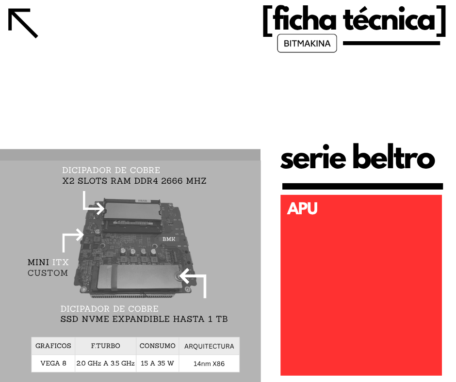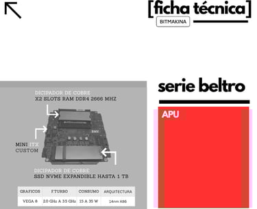 Desarrollamos nuestra serie beltro con una placa madre Mini-ITX - "All in one" personalizada adecuando un disipador y ventilador para la APU integrada la cual se encuentra soldada optimizando temperaturas y potencia. Nuestro chasis esta elaborado a la medida fabricado en filamento PETG ( TERMOPLASTICO ) Este material soporta + de 70° en temperaturas directas de igual manera es flexible Duradero y alta mente moldeable en impresión 3D.